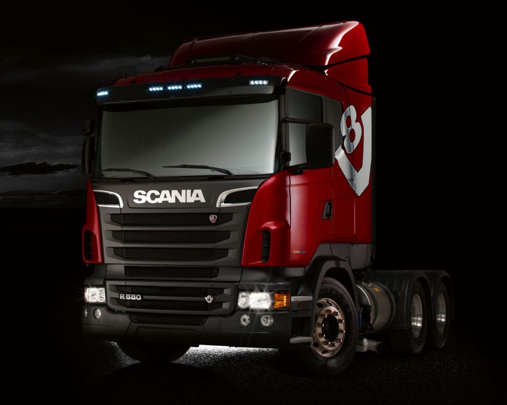 This is a 16-liter V8 engine with an output of 580 hp and torque of 2,700 Nm. The interior of the truck used expensive materials – leather for the seats and steering wheel, metallic plates with V8 logos the pedals. Outside the new version can be distinguished by a ruby-red color of the cab with white ‘V8″ logos on it. There is a chromed Scania logo on the black front grille. The trucks received xenon headlights and LED clearance lights. The “King of the Road” is also available with a less powerful 500-horsepower engine as a 6×2 or 6×4 truck.