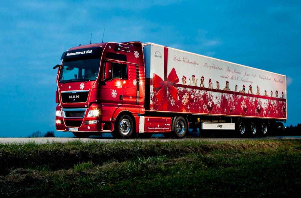 Trainees from MAN Nutzfahrzeuge AG in Munich have transformed the two metallic red 540-hp MAN TGX semitrailers into real Christmas trucks: 200-metre long chains of lights, able to withstand weather and washing systems, have been mounted on each of the tractors and their trailers, which have been fittingly decorated for Christmas. The trainees framed the radiator grilles with hundreds and hundreds of LEDs. What makes this year special is the way the trailers have been decorated: the children who make up the motif are all at the kindergarten of the MAN plant in Munich, “Löwenkinder”.