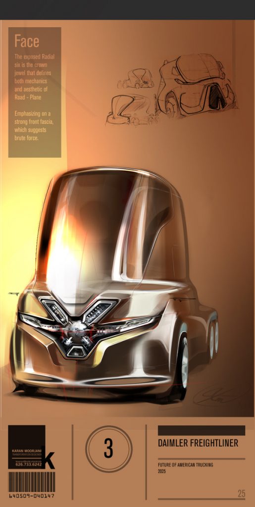 It was created by the American designer Karan Moorjani. The designer decided to return the aircraft motives of the 60es to future design of US trucks. He calls the truck as ‘Road Plane’ and the driver as ‘Road Pilot’. So what is in this truck from aircraft? Of course the design with smooth lines is similar to a fuselage of an aircraft. But the most important thing is a six beam radial engine, like a military propeller aircrafts of WWII. The engine is positioned horizontally between the axes of the truck. Grille design also uses a radial aircraft engine style. As a result, the exterior has turned a very unique and original, but technically the project has no perspective – it will be extremely difficult to design such an engine and properly install it in the truck.