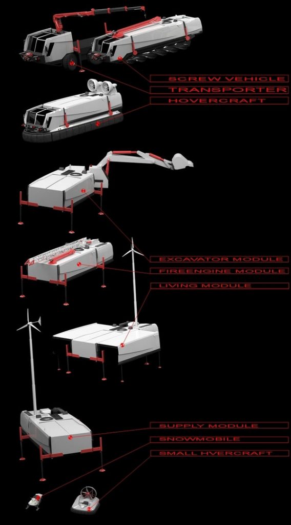 They can be charged by wind generator with solar panels. Vehicles can be driven on electricity or diesel engine or both. All equipment is detachable and can be put from transporter to hovercraft and crew vehicle. All the vehicles are amphibious, so they can save people from flooded areas. Modules types: supply (power station with wind generator and solar panels and water cleaning filters and water generators), excavator module , fire engine module, living module, hospital module, ladder module. Transporter has a trunk for small hovercraft and snowmobile or specialized necessary equipment and crane manipulator. All the modules can be connected creating hospital with supply module, houses for people or mobile power station or water filtration station.