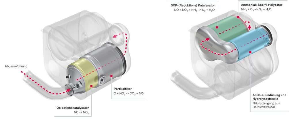 With the advent of Euro VI, SCR is for the first time being installed in TGL and TGM vehicles, where it supplements the proven EGR technology. The basis is formed by the Euro V / EEV engines, which have been produced in series since 2009. EGR with demand-controlled recirculation rate and the common-rail system with 1,800 bar injection pressure are the backbone of the Euro VI system in the engine itself. The power spectrum ranges from 110 kW / 150 hp to 251 kW / 341 hp.