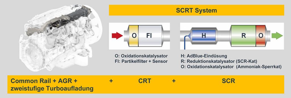 The central components for Euro VI are, on the engine side, common-rail- injection, cooled and controlled exhaust-gas recirculation and two-stage turbocharging. These are followed by exhaust-gas aftertreatment by an SCR system with integrated oxidation catalytic converter plus CRT filter (Continuously Regenerating Trap). Electronic sensors permanently monitor the absorption capacity of the particulate filter. Also integrated into the SCRT system are the sensors monitoring NOx. Because the Euro VI standard makes the use of a diesel particulate filter practically unavoidable, the developers had more latitude in optimising combustion design and fuel consumption. Common-rail injection functions at pressures of up to 1,800 bar. This system has been standard at MAN since 2002 and the Euro V, EEV and Euro VI engines are already equipped with third-generation CR systems.