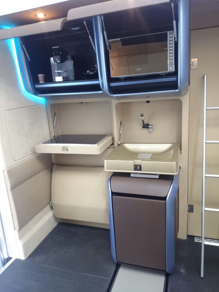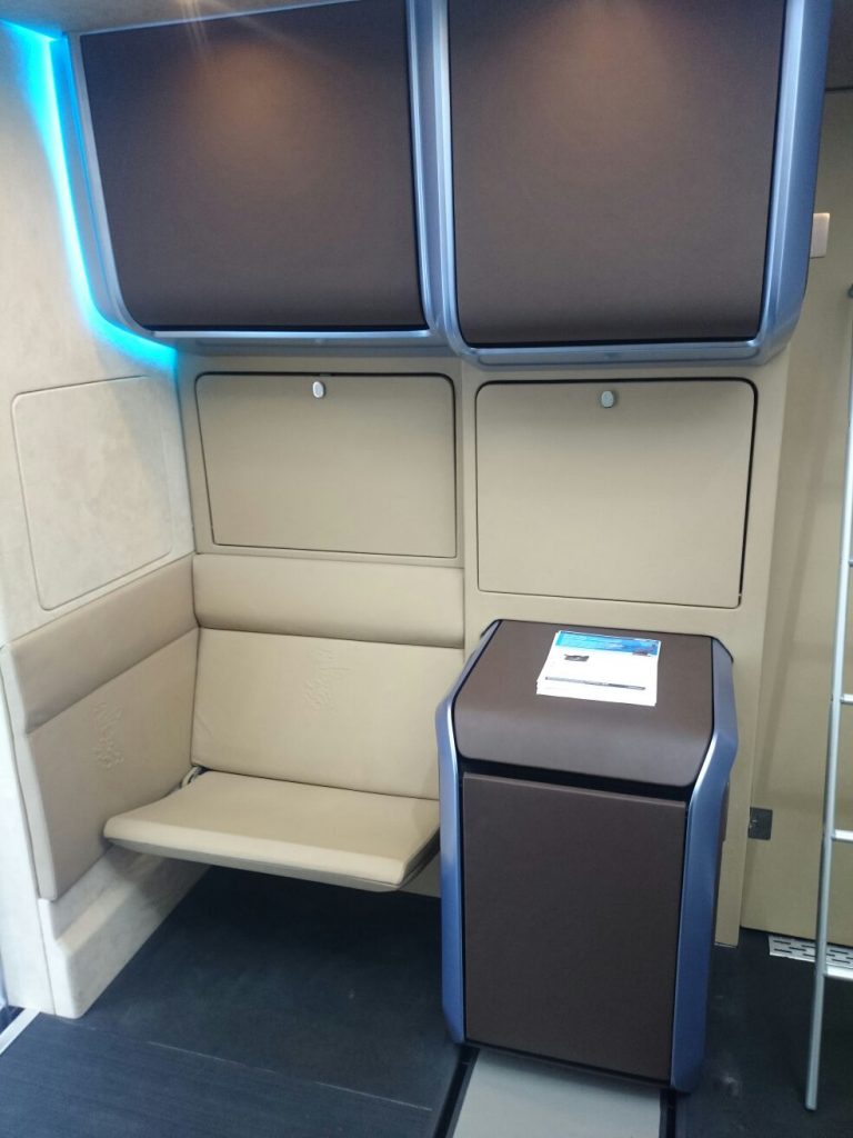 Some drawers are equipped with locks for private documentary storage. The cabin also has a sanitation zone, which includes a shower with LED lighting and a toilet. A fully functioning kitchen is equipped with a microwave oven, coffee-machine, induction stove and a refrigerator. A sofa at the rear will always help the driver to relax. The floor can be transformed into a treadmill.