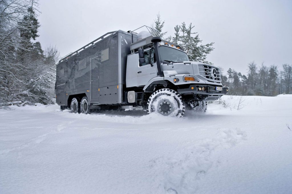 A 7.2-liter inline-six diesel engine with 326 horsepower and 960 pound-feet of torque does the pushing/pulling duties, driving all six wheels for a chassis load capacity of 16 metric tons. Both vehicles have substantially identical bodies, though one of the two examples also has a rear vehicle bay able to accommodate a quadbike. The luxury long-distance off-roaders have an imposing length of 10.70 m (plus 60 cm for the model with rear vehicle bay), a width of 2.70 m and a height of 4.20 m.
