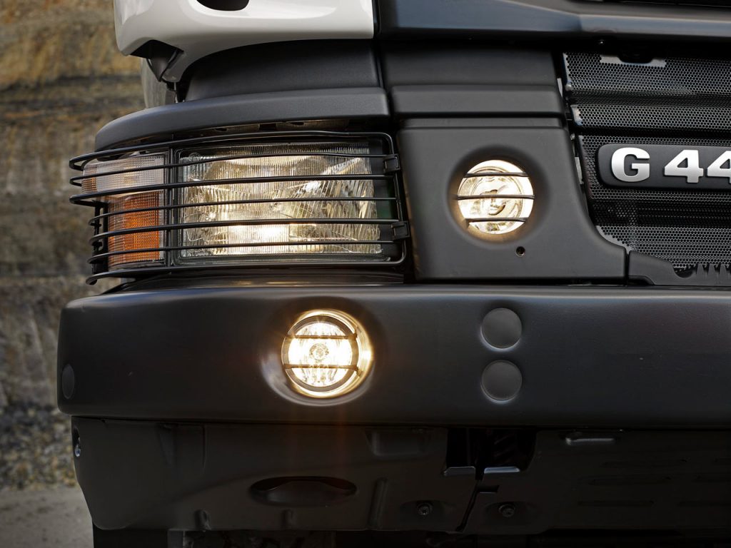 The new off-road trucks have been styled to look the part and to be fit for the toughest tasks. The solid black grille and bumper structure reinforce the impression of strength and continues the ‘wrapping T’ theme that is so unmistakably Scania. In addition, some unique off-road styling and comfort touches make the vehicles stand out even more from the crowd. The headlamp and indicator units are mounted separately and further away from the bumper for additional protection against impact. Steel guards are fitted on the headlamp units and on the optional fog lights and spotlights, which are integrated in the bumper structure. A robust fixed headlamp cleaning system is available.