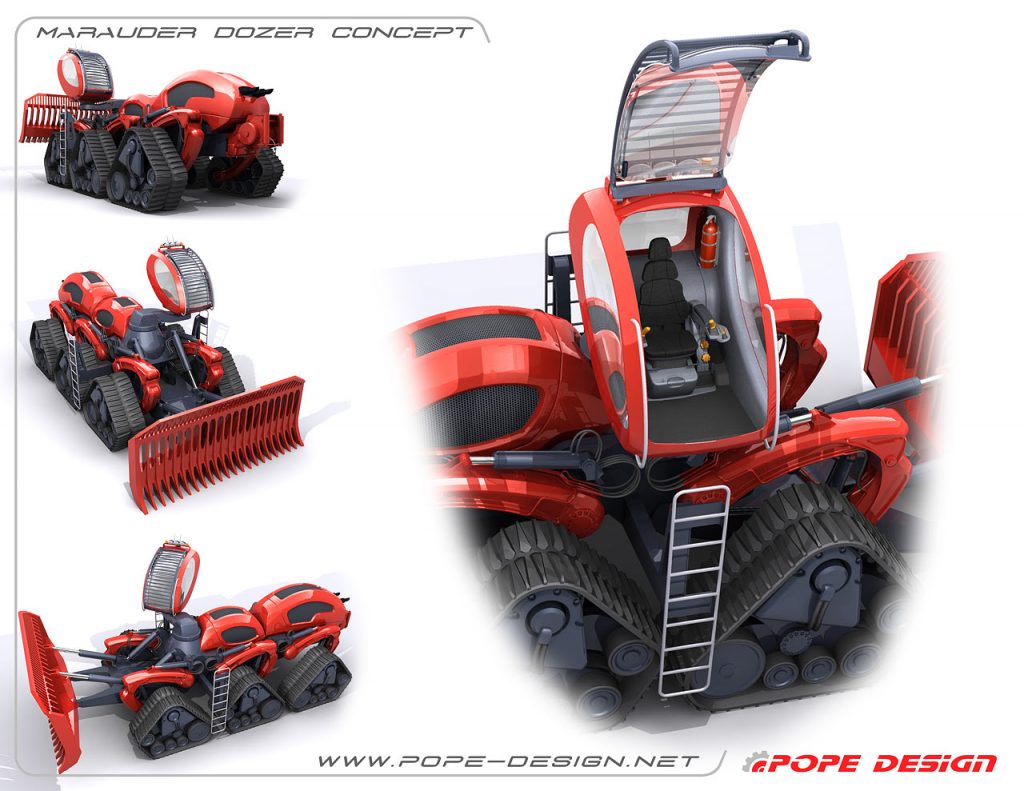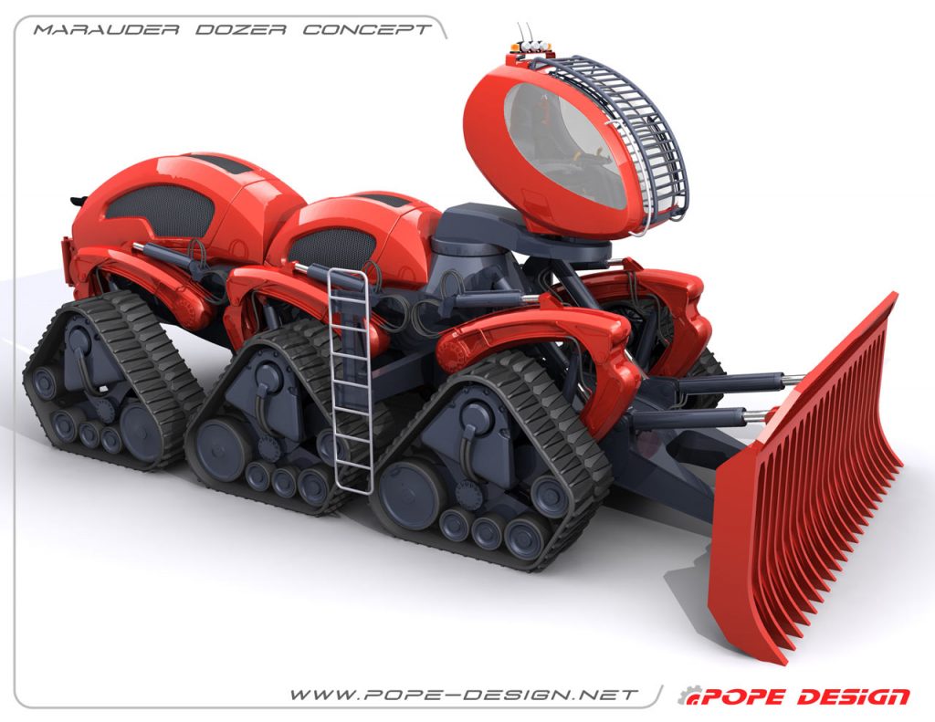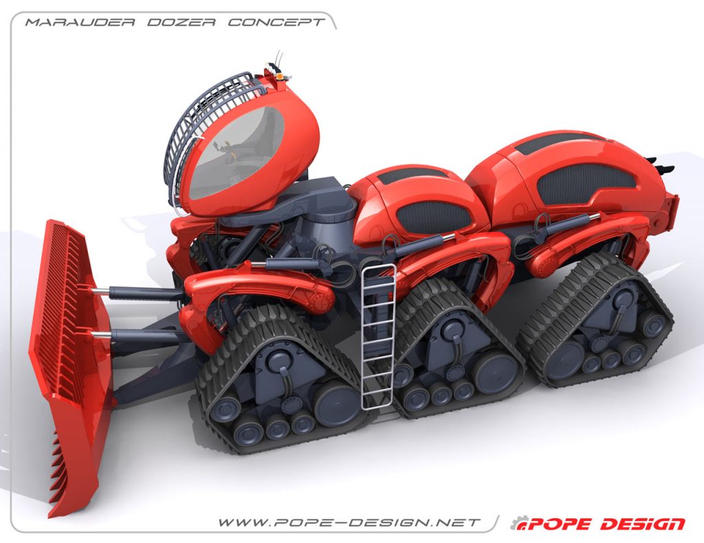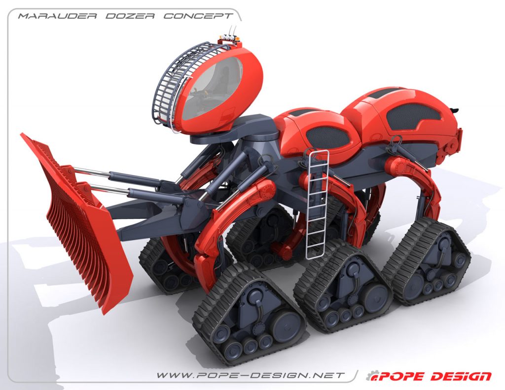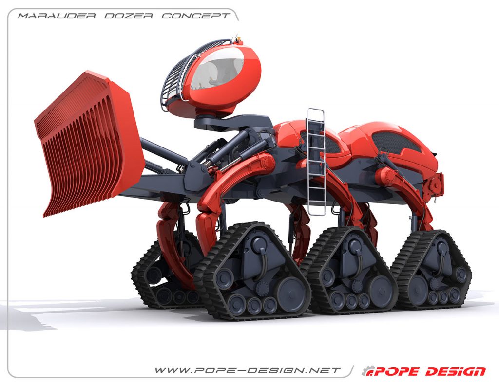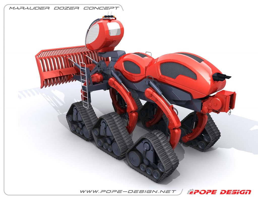 The Marauder Dozer is inspired specifically by the Marauder worker ant. The worker ant’s only job is to clear a path for the rest of the troops. Pope’s gigantic bulldozer is designed to do just this. The Marauder Dozer sits on six treads and features a blade measuring 17.8 feet long and 8.2 feet high. This impressive piece of heavy machinery can also raise its cab up to 13 feet in the air to allow its operator to drive through flooded areas. Pope’s design is meant for clearing a path during forest fires or after natural disasters.