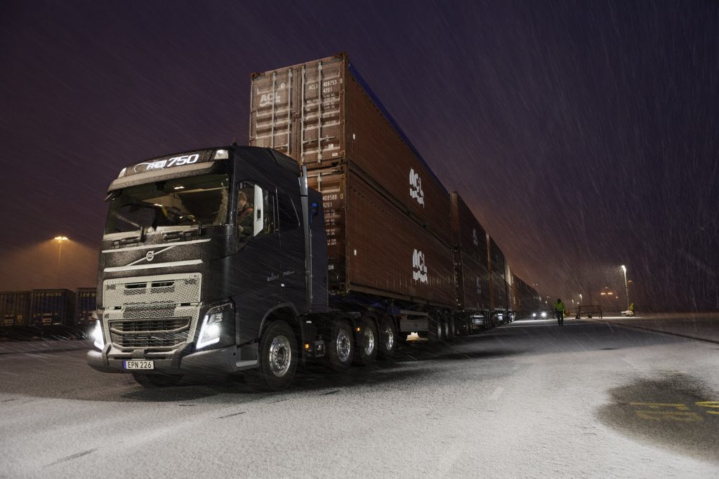 The action took place in the Port of Gothenburg, Sweden, where 40 containers filled with Volvo spare parts were arranged to form a 300-metre long road train. The tractor unit used was a factory-stock, no-nonsense FH16 750, and while its crawler transmission allows it to drive as slowly as 0.5 km/h in order to move really heavy loads in difficult terrain, trying to move 750 tons was a herculean task, as anything could go wrong – from couplings, to the clutch to the transmission itself.